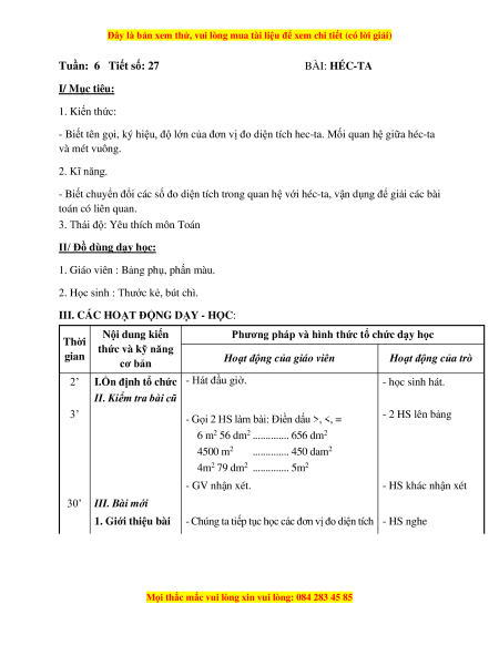 Tuần: 6 Tiết số: 27 BÀI: HÉC-TA I/ Mục tiêu: 1. Kiến thức: