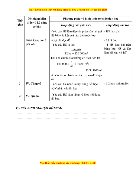 HS báo cáo kết quả làm bài trước lớp Bài 4: Củng cố về - Gọi HS đọc đề - 1 HS đọc giải toán - Yêu cầu HS tự làm - 1 HS làm bài trên Bài giải bảng lớp. HS cả lớp 12 ha = 120 000m2 làm bài vào vở BT