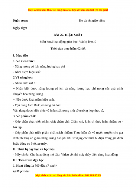 Ngày soạn: Họ và tên giáo viên: Ngày dạy: BÀI 27. HIỆU SUẤT