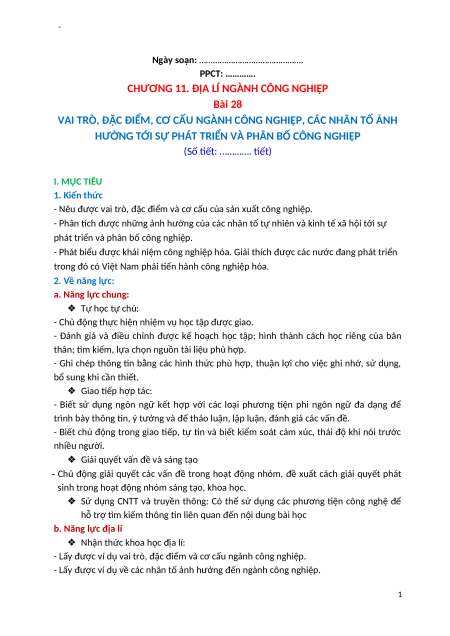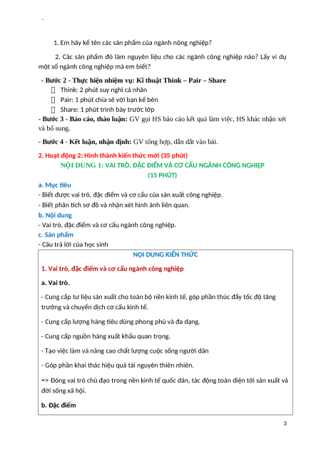 NỘI DUNG 1: VAI TRÒ, ĐẶC ĐIỂM VÀ CƠ CẤU NGÀNH CÔNG NGHIỆP (15 PHÚT) a. Mục tiêu