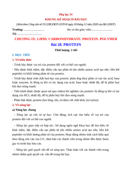 CHƯƠNG IX: LIPID. CARBONHYDRATE. PROTEIN. POLYMER Bài 28. PROTEIN