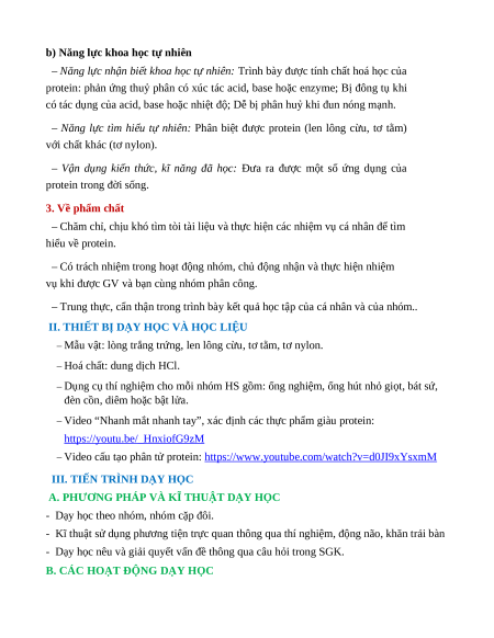 - Phân biệt được protein (len lông cừu, tơ tằm) với chất khác (tơ nylon). 2. Về năng lực a) Năng lực chung