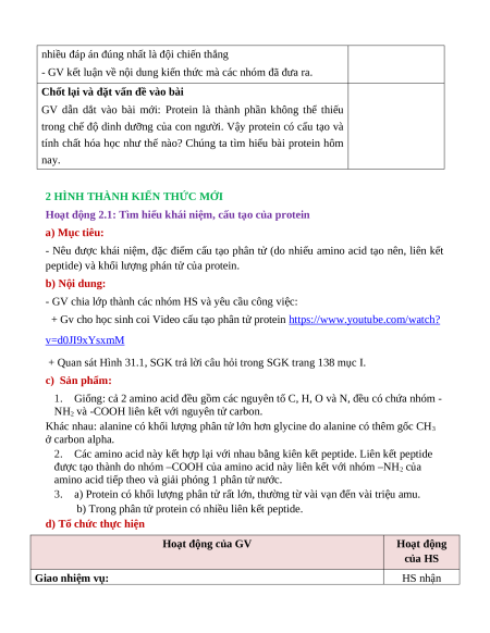 Hoạt động 2.1: Tìm hiểu khái niệm, cấu tạo của protein a) Mục tiêu: