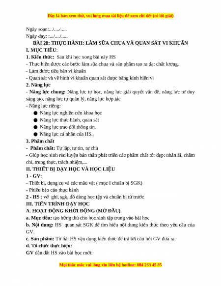 BÀI 28: THỰC HÀNH: LÀM SỮA CHUA VÀ QUAN SÁT VI KHUẨN I. MỤC TIÊU: