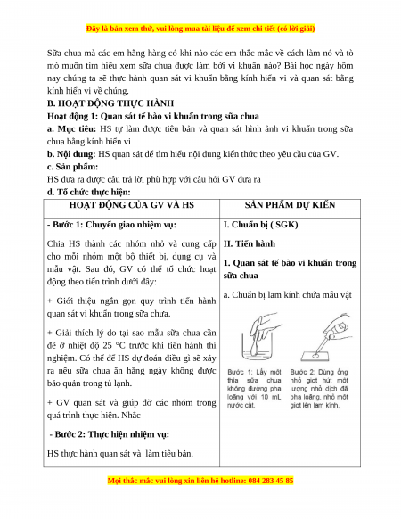 a. Mục tiêu: HS tự làm được tiêu bản và quan sát hình ảnh vi khuẩn trong sữa chua bằng kính hiển vi