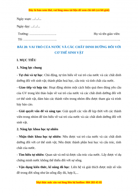 BÀI 28: VAI TRÒ CỦA NƯỚC VÀ CÁC CHẤT DINH DƯỠNG ĐỐI VỚI CƠ THỂ SINH VẬT I. MỤC TIÊU 1. Năng lực chung