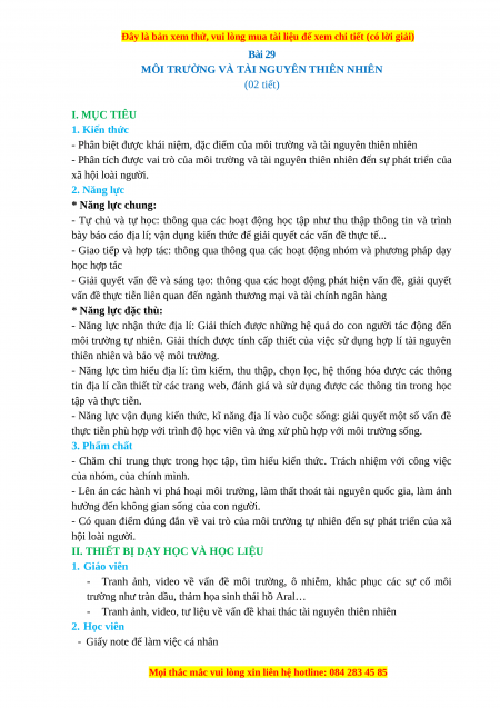 Giáo án Bài 29 Địa lí 10 Cánh Diều (2024): Môi trường và tài nguyên thiên nhiên