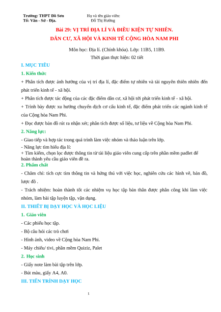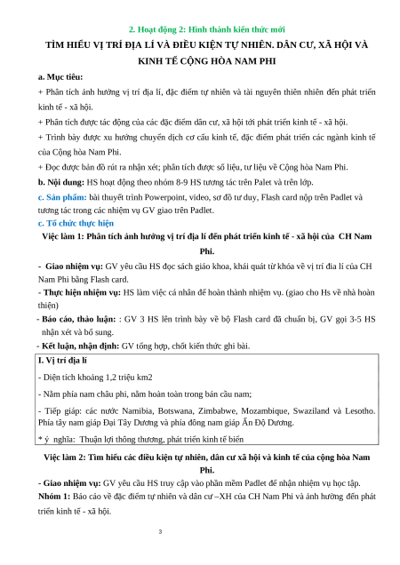 + Đọc được bản đồ rút ra nhận xét; phân tích được số liệu, tư liệu về Cộng hòa Nam Phi. 2. Năng lực: