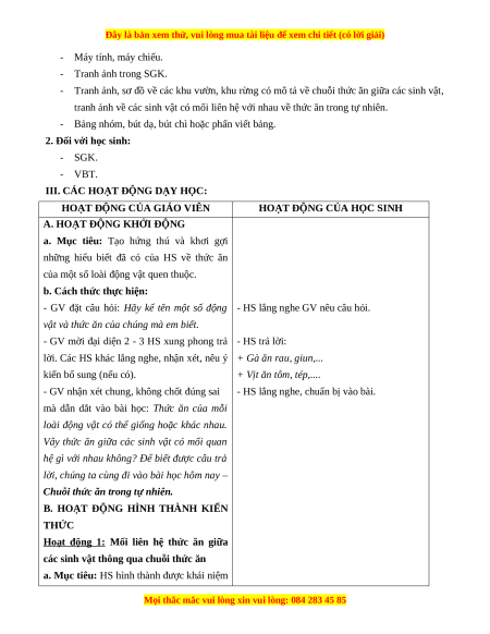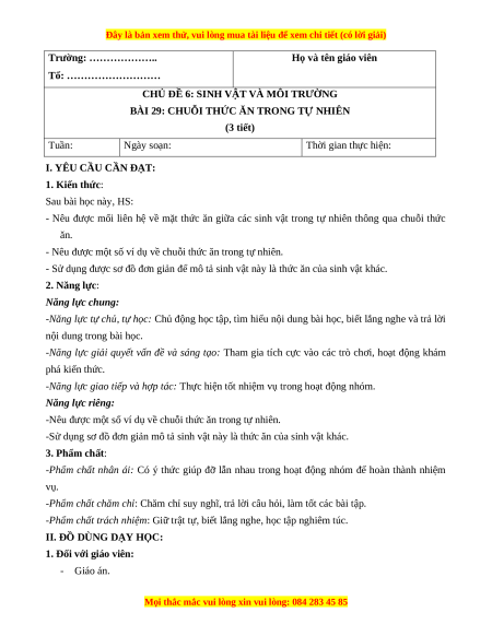 BÀI 29: CHUỖI THỨC ĂN TRONG TỰ NHIÊN (3 tiết) Tuần: Ngày soạn: Thời gian thực hiện: I. YÊU CẦU CẦN ĐẠT: 1. Kiến thức: Sau bài học này, HS: