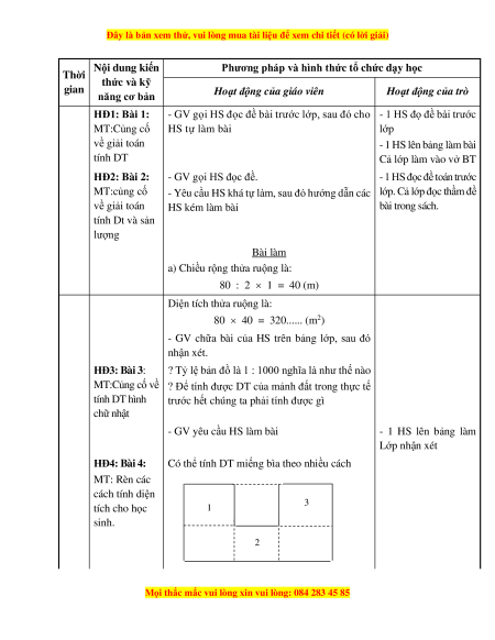 - GV gọi HS đọc đề bài trước lớp, sau đó cho - 1 HS đọ đề bài trước MT:Củng cố HS tự làm bài lớp về giải toán - 1 HS lên bảng làm bài tính DT Cả lớp làm vào vở BT HĐ2: Bài 2: - GV gọi HS đọc đề.