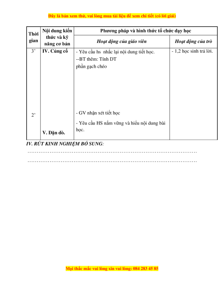 - Yêu cầu hs nhắc lại nội dung tiết học. - 1,2 học sinh trả lời. --BT thêm: Tính DT phần gạch chéo 2’ - GV nhận xét tiết học