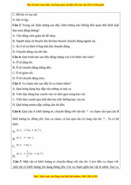 Câu 2: Định luật bảo toàn động lượng chỉ đúng trong trường hợp A. Hệ có ma sát. B. Hệ có ma sát.