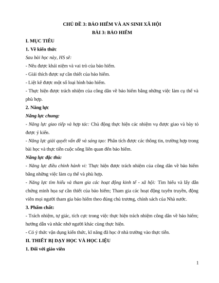 CHỦ ĐỀ 3: BẢO HIỂM VÀ AN SINH XÃ HỘI BÀI 3: BẢO HIỂM I. MỤC TIÊU 1. Về kiến thức