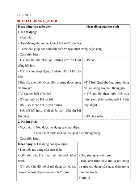 + Bước đầu giúp học sinh tìm hiểu về quạt điện trong cuộc sống. - Cách tiến hành: