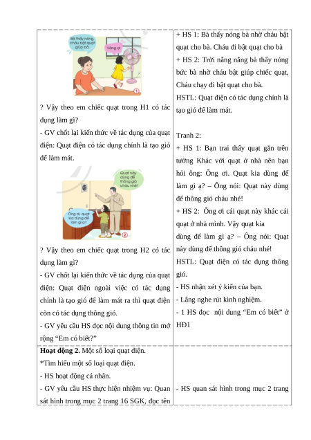 - GV yêu cầu HS mô tả nội dung và nêu tác và nêu tác dụng của quạt điện trong