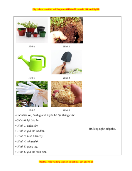- GV nhận xét, đánh giá và tuyên bố đội thắng cuộc. - GV chốt lại đáp án: + Hình 1: chậu cây. - HS lắng nghe, tiếp thu.