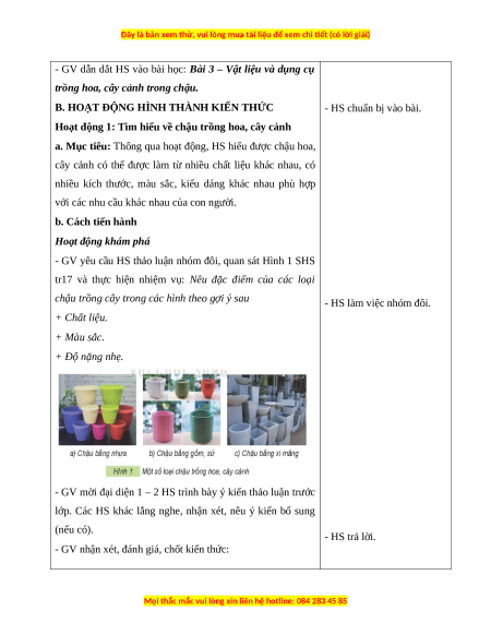 nghiệm của bản thân về các vật liệu và dụng cụ trồng hoa, cây cảnh trong chậu. b. Cách tiến hành