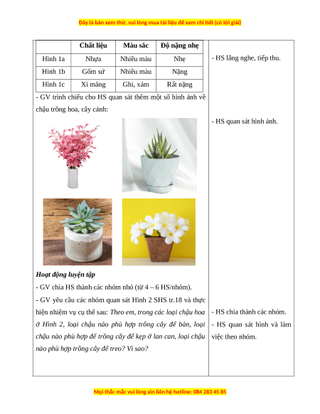 chậu trồng cây trong các hình theo gợi ý sau - HS làm việc nhóm đôi. + Chất liệu. + Màu sắc. + Độ nặng nhẹ.