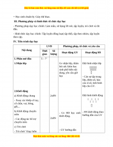 Phương pháp, tổ chức và yêu cầu Nội dung Thời Số Hoạt động GV Hoạt động HS gian lượng I. Phần mở đầu 5 – 7’ 1.Nhận lớp Gv nhận lớp, thăm Đội hình nhận lớp hỏi sức khỏe học sinh phổ biến nội dung, yêu cầu giờ học - Cán sự tập trung lớp, điểm số, báo cáo sĩ số, tình hình lớp cho GV. 2.Khởi động a) Khởi động chung 2x8N Đội hình khởi động - Xoay các khớp cổ tay, cổ chân, vai, hông, gối,... b) Khởi động chuyên