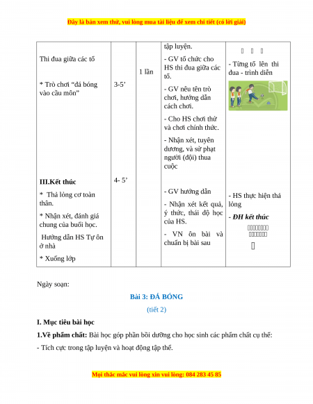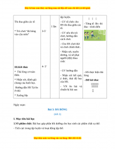 ý thức, thái độ học - ĐH kết thúc chung của buổi học. của HS. Hướng dẫn HS Tự ôn - VN ôn bài và ở nhà chuẩn bị bài sau * Xuống lớp Ngày soạn: Bài 3: ĐÁ BÓNG (tiết 2)