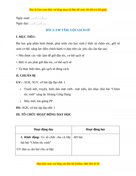 BÀI 3: EM TẮM, GỘI SẠCH SẼ I. MỤC TIÊU: