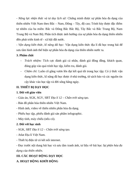 hóa đa dạng của thiên nhiên nước ta. 2. Năng lực