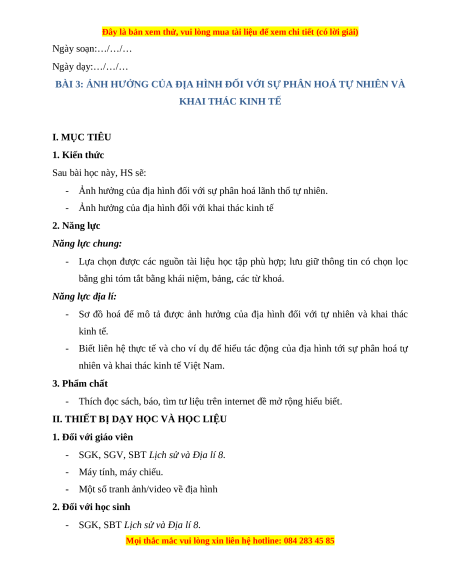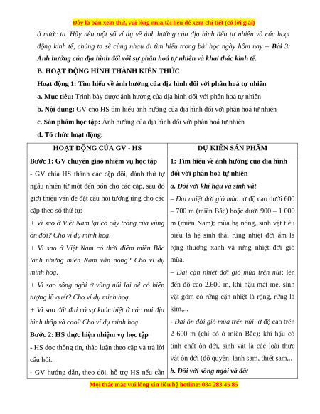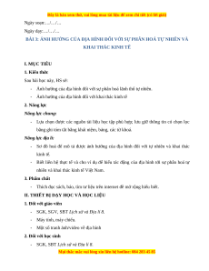 BÀI 3: ẢNH HƯỞNG CỦA ĐỊA HÌNH ĐỐI VỚI SỰ PHÂN HOÁ TỰ NHIÊN VÀ KHAI THÁC KINH TẾ I. MỤC TIÊU 1. Kiến thức Sau bài học này, HS sẽ: