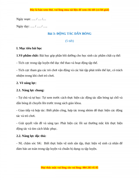 Giáo án Bài 3: Động tác dẫn bóng Giáo dục thể chất lớp 1 Kết nối tri thức