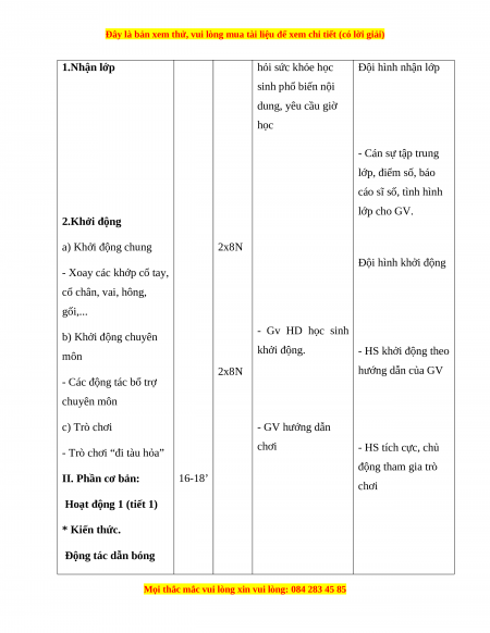 1.Nhận lớp hỏi sức khỏe học Đội hình nhận lớp sinh phổ biến nội dung, yêu cầu giờ học - Cán sự tập trung lớp, điểm số, báo cáo sĩ số, tình hình lớp cho GV. 2.Khởi động a) Khởi động chung 2x8N Đội hình khởi động - Xoay các khớp cổ tay, cổ chân, vai, hông, gối,... - Gv HD học sinh b) Khởi động chuyên khởi động. môn - HS khởi động theo 2x8N hướng dẫn của GV