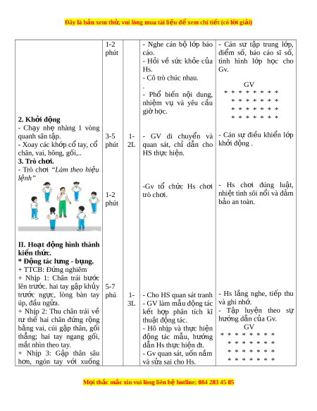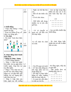 Đây là bản xem th , vu ử i lòng mua tài li u ệ đ xe ể m chi ti t (c ế ó l i ờ gi i ả ) 1-2 - Nghe cán bộ l p ớ báo - Cán sư t p ậ trung l p, ớ phút cáo. đi m ể số, báo cáo sĩ s , ố - H i ỏ về s c ứ kh e ỏ c a ủ tình hình l p ớ h c ọ cho Hs. Gv. - Cô trò chúc nhau. . GV - Phổ bi n ế n i ộ dung, * * * * * * * * nhiệm vụ và yêu c u ầ * * * * * * * gi h ờ c. ọ * * * * * * * 2. Kh i ở đ ng ộ * * * * * * * - Ch y ạ nhẹ nhàng 1 vòng quanh sân t p. ậ 3-5 1- - GV di chuy n ể và - Cán sự đi u ề khi n ể l p ớ - Xoay các kh p c ớ ổ tay, cổ phút 2L quan sát, chỉ d n ẫ cho kh i ở đ ng ộ . chân, vai, hông, gối,.. HS th c hi ự n. ệ 3. Trò ch i ơ . - Trò ch i ơ “Làm theo hi u ệ lệnh” -Gv tổ ch c ứ Hs ch i ơ - Hs ch i ơ đúng lu t ậ , 1-2 trò ch i ơ . nhiệt tình sôi n i ổ và đ m ả phút b o ả an toàn. II. Hoạt đ ng ộ hình thành ki n t ế h c. ứ * Đ ng t ộ ác l ng - ư b ng. ụ + TTCB: Đ ng nghi ứ êm + Nh p ị 1: Chân trái bư c ớ lên trư c. ớ hai tay g p ậ kh y ủ 5-7 trư c ớ ng c, ự lòng bàn tay phú 1-