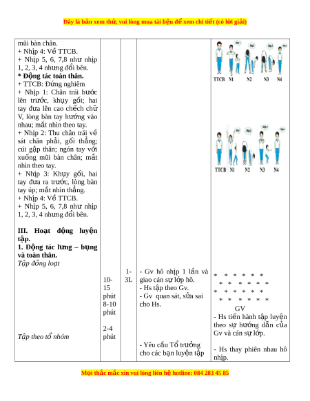 Đây là bản xem th , vu ử i lòng mua tài li u ệ đ xe ể m chi ti t (c ế ó l i ờ gi i ả ) mũi bàn chân. + Nh p 4 ị : V ề TTCB. + Nh p ị 5, 6, 7,8 như nh p ị 1, 2, 3, 4 nh ng đ ư ổi bên. * Đ ng t ộ ác toàn thân. + TTCB: Đ ng nghi ứ êm + Nh p ị 1: Chân trái bư c ớ lên trư c, ớ kh y ụ g i ố ; hai tay đ a ư lên cao ch ch ế chữ V, lòng bàn tay hư ng ớ vào nhau; m t ắ nhìn theo tay. + Nh p ị 2: Thu chân trái về sát chân ph i ả , g i ố th ng; ẳ cúi g p ậ thân; ngón tay v i ớ xuống mũi bàn chân; m t ắ nhìn theo tay. + Nh p ị 3: Kh y ụ g i ố , hai tay đ a ư ra trư c, ớ lòng bàn tay úp; m t ắ nhìn th ng. ẳ + Nh p 4 ị : V ề TTCB. + Nh p ị 5, 6, 7,8 như nh p ị 1, 2, 3, 4 nh ng đ ư ổi bên. III. Hoạt đ ng ộ luy n ệ tập. 1. Đ ng ộ tác l ng ư – b ng ụ và toàn thân. T p đ ậ ồng lo t ạ 1- - Gv hô nh p ị 1 l n ầ và 10- 3L giao cán s l ự p ớ hô. * * * * * * 15 - Hs t p ậ theo Gv. * * * * * * phút - Gv quan sát, s a ử sai * * * * * * 8-10 cho Hs. * * * * * * phút GV - Hs ti n ế hành t p ậ luy n ệ 2-4 theo sự hư ng ớ d n ẫ c a ủ T p t ậ heo tổ nhóm phút Gv và cán s l ự p ớ . - Yêu c u ầ Tổ trư ng ở cho các b n l ạ uyện t p ậ - Hs thay phiên nhau hô nhịp. M i