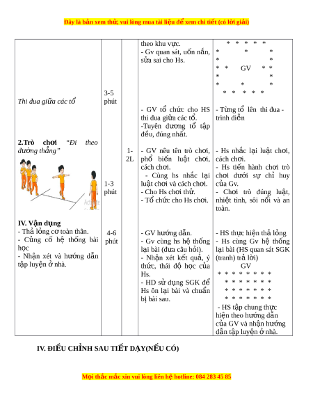 Đây là bản xem th , vu ử i lòng mua tài li u ệ đ xe ể m chi ti t (c ế ó l i ờ gi i ả ) theo khu v c. ự * * * * * - Gv quan sát, u n ố n n, ắ * * * s a ử sai cho Hs. * * * * GV * * * * * * * 3-5 * * * * * Thi đua gi a ữ các t ổ phút - GV tổ ch c ứ cho HS - T ng t ừ ổ lên thi đua - thi đua gi a ữ các tổ. trình di n ễ -Tuyên dư ng ơ tổ t p ậ đ u, đúng nh ề ất. 2.Trò ch i ơ “Đi theo đư ng t ờ h ng” ẳ 1- - GV nêu tên trò ch i ơ , - Hs nh c ắ l i ạ lu t ậ ch i ơ , 2L phổ bi n ế lu t ậ ch i ơ , cách ch i ơ . cách ch i ơ . - Hs ti n ế hành ch i ơ trò - Cùng hs nh c ắ l i ạ ch i ơ dư i ớ sự chỉ huy 1-3 lu t ậ ch i ơ và cách ch i ơ . c a ủ Gv. phút - Cho Hs ch i ơ th . ử - Ch i ơ trò đúng lu t ậ , - Tổ ch c cho H ứ s ch i ơ . nhiệt tình, sôi n i ổ và an toàn. IV. Vận dụng - Thả l ng c ỏ t ơ oàn thân. 4-6 - GV hư ng d ớ n. ẫ - HS th c hi ự n t ệ h l ả ng ỏ - C ng ủ cố hệ th ng ố bài phút - Gv cùng hs hệ th ng ố - Hs cùng Gv hệ th ng ố h c ọ l i ạ bài (đ a ư câu h i ỏ ). l i ạ bài (HS quan sát SGK - Nh n ậ xét và hư ng ớ d n ẫ - Nh n ậ xét k t ế qu , ả ý (tranh) tr l ả i ờ ) t p l ậ uyện nhà. ở th c, ứ thái độ h c ọ c a ủ GV Hs. * * * * * * * * - HD sử d ng ụ SGK để * * * * * * * Hs ôn l i ạ bài và chu n ẩ * * * * * * * bị bài sau. * * * * * * * - HS t p chung t ậ h c ự hiện theo hư ng ớ d n ẫ c a ủ GV và nh n h ậ ư ng ớ dẫn t p l ậ uy n ệ nhà. ở IV. ĐIỀU CH N Ỉ H SAU TI T Ế D Y Ạ (N U Ế CÓ) M i