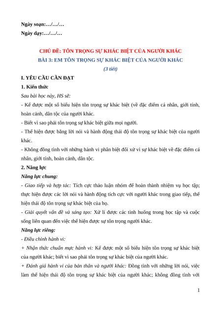 BÀI 3: EM TÔN TRỌNG SỰ KHÁC BIỆT CỦA NGƯỜI KHÁC (3 tiết)