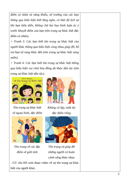 Giáo án Bài 3: Em tôn trọng sự khác biệt của người khác Đạo đức lớp 5 Chân trời sáng tạo