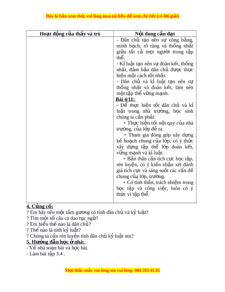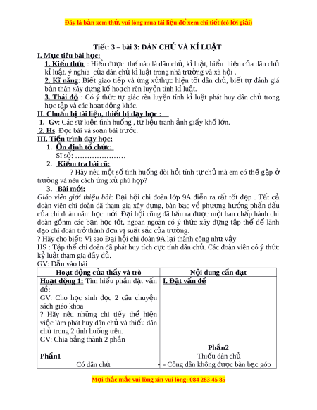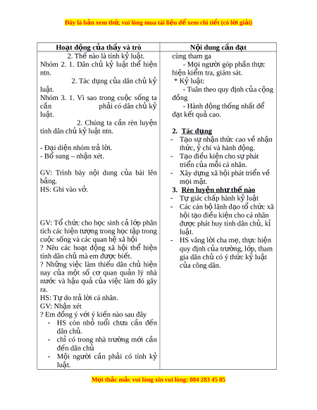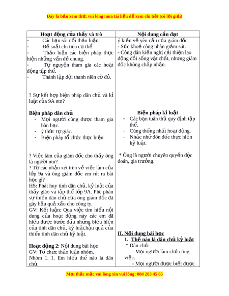 Đây là bản xem th , vu ử i lòng mua tài li u ệ đ xe ể m chi ti t (c ế ó l i ờ gi i ả ) Hoạt đ ng c ộ a t ủ h y và t ầ rò N i ộ dung c n đ ầ t ạ - Các b n ạ sôi n i ổ th o ả lu n. ậ ý ki n v ế yêu c ề ầu c a ủ giám đốc. - Đề suất chi tiêu c t ụ hể - S c ứ khoẻ công nhân gi m ả sút. - Th o ả lu n ậ các bi n ệ pháp th c ự - Công dân ki n ngh ế ị c i ả thi n l ệ ao hiện nh ng v ữ ấn đ chung. ề đ ng đ ộ ồi sống v t ậ chất, nh ng gi ư ám - Tự nguy n ệ tham gia các ho t ạ đốc không chấp nh n. ậ đ ng ộ t p t ậ h . ể - Thành l p ậ đ i ộ thanh niên cờ đ . ỏ ? Sự k t ế h p ợ bi n ệ pháp dân chủ và kỉ lu t ậ c a 9A ủ ntn? Bi n ệ pháp dân chủ Bi n ệ pháp k l ỉ u t ậ - M i ọ ngư i ờ cùng đư c ợ tham gia - Các b n t ạ uân th quy đ ủ nh t ị p ậ bàn bạc. th . ể - ý th c ứ t gi ự ác. - Cùng thống nh t ấ ho t ạ đ ng. ộ - Biện pháp tổ ch c ứ th c hi ự n ệ - Nh c ắ nh đôn đ ở ốc th c hi ự n ệ k l ỷ u t ậ . ? Vi c ệ làm c a ủ giám đ c ố cho th y ấ ông * Ông là ngư i ờ chuyên quy n đ ề c ộ là ngư i ờ ntn? đoán, gia trư ng. ở ? T ừ các nh n ậ xét trên về vi c l ệ àm c a ủ l p ớ 9a và ông giám đ c ố em rút ra bài h c ọ gì? HS: Phát huy tính dân ch , ủ k ỷ lu t ậ c a ủ thầy giáo và t p ậ thể l p ớ 9A. Phê phán sự thi u ế dân chủ c a ủ ông giám đ c ố đã gây h u ậ qu x ả ấu cho công ty. GV: K t ế lu n: ậ Qua vi c ệ tìm hi u ể n i ộ dung c a ủ ho t ạ đ ng ộ này các em đã hi u ể đư c ợ bư c ớ đ u ầ nh ng ữ bi u ể hi n ệ c a ủ tính dân ch , ủ kỷ lu t ậ ,h u ậ quả c a ủ thi u t ế ính dân chủ k l ỷ u t ậ . II. N i ộ dung bài h c ọ 1. T h nào l ế à dân ch k ủ l ỷ u t ậ Hoạt đ ng 2 ộ : N i ộ dung bài h c ọ * Dân ch : ủ GV: Tổ ch c t ứ h o ả lu n nhóm ậ . - M i ọ ngư i ờ làm chủ công Nhóm 1. 1. Em hi u ể thế nào là dân việc. ch . ủ - M i ọ ngư i ờ đư c ợ bi t ế đư c ợ M i ọ thắc m c