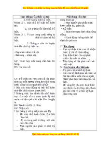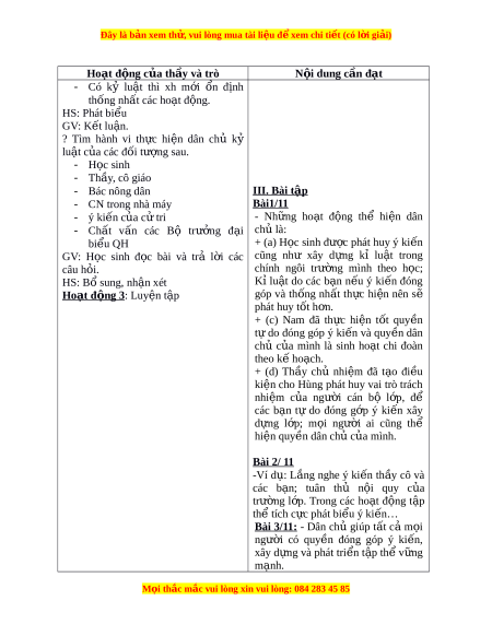Đây là bản xem th , vu ử i lòng mua tài li u ệ đ xe ể m chi ti t (c ế ó l i ờ gi i ả ) Hoạt đ ng c ộ a t ủ h y và t ầ rò N i ộ dung c n đ ầ t ạ - Có kỷ lu t ậ thì xh m i ớ n ổ đ nh ị thống nhất các ho t ạ đ ng. ộ HS: Phát bi u ể GV: K t ế lu n. ậ ? Tìm hành vi th c ự hi n ệ dân chủ kỷ lu t ậ c a các ủ đối tư ng ợ sau. - H c ọ sinh - Th y ầ , cô giáo - Bác nông dân III. Bài tập - CN trong nhà máy Bài1/11 - ý ki n c ế a ủ c t ử ri - Nh ng ữ ho t ạ đ ng ộ thể hi n ệ dân - Chất v n ấ các Bộ trư ng ở đ i ạ ch l ủ à: bi u Q ể H + (a) H c ọ sinh đư c ợ phát huy ý ki n ế GV: H c ọ sinh đ c ọ bài và trả l i ờ các cũng như xây d ng ự kỉ lu t ậ trong câu h i ỏ . chính ngôi trư ng ờ mình theo h c; ọ HS: Bổ sung, nh n xét ậ Kỉ lu t ậ do các b n ạ n u ế ý ki n ế đóng Hoạt đ ng 3 ộ : Luyện t p ậ góp và th ng ố nh t ấ th c ự hi n ệ nên sẽ phát huy tốt h n. ơ + (c) Nam đã th c ự hi n ệ t t ố quy n ề tự do đóng góp ý ki n ế và quy n ề dân chủ c a ủ mình là sinh ho t ạ chi đoàn theo k ho ế ch. ạ + (d) Th y ầ chủ nhi m ệ đã t o ạ đi u ề