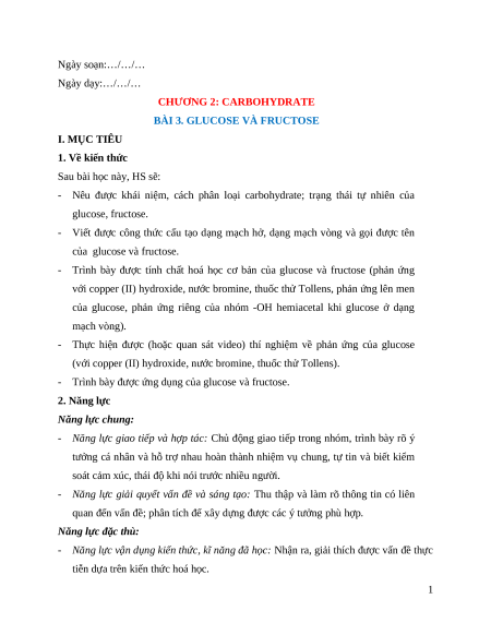 BÀI 3. GLUCOSE VÀ FRUCTOSE I. MỤC TIÊU 1. Về kiến thức Sau bài học này, HS sẽ: