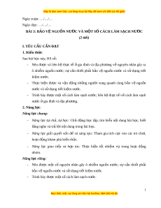 Ngày so n ạ : …/…/… Ngày d y ạ : …/…/… BÀI 3: B O Ả VỆ NGU N Ồ NƯ C Ớ VÀ M T Ộ S Ố CÁCH LÀM S C Ạ H NƯ C Ớ (2 ti t ế ) I. YÊU CẦU C N Ầ Đ T Ạ 1. Ki n ế th c ứ : Sau bài h c ọ này, HS s : ẽ - Nêu đ c ượ và liên h ệ th c ự tế ở gia đình và đ a ị ph n ươ g v ề nguyên nhân gây ra ô nhi m ễ ngu n ồ n c; ướ sự c n ầ thi t ế ph i ả b o ả vệ ngu n ồ n c ướ và s ử d n ụ g ti t ế kiệm n c. ướ - Th c ự hi n ệ đ c ượ và v n ậ đ n ộ g nh n ữ g ng i ườ xung quanh cùng b o ả vệ ngu n ồ n c ướ và s ử d n ụ g ti t ế ki m ệ n c. ướ - Trình bày đ c ượ m t ộ s ố cách làm s ch ạ n c ướ ; liên h ệ th c ự t ế v ề cách làm s c ạ h n c ướ ở gia đình và đ a ị ph n ươ g. 2. Năng l c ự : Năng l c ự chung: - Năng l c ự tự ch , ủ tự h c ọ : Chủ đ n ộ g h c ọ t p ậ , tìm hi u ể n i ộ dung bài h c, ọ bi t ế l n ắ g nghe và tr ả l i ờ n i ộ dung trong bài h c. ọ - Năng l c ự gi i ả quy t ế v n ấ đề và sáng t o