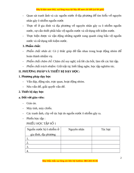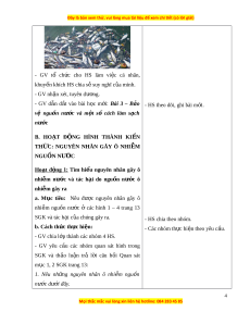 II. PHƯƠNG PHÁP VÀ THI T Ế B Ị D Y Ạ H C Ọ : 1. Phư ng ơ pháp d y ạ h c ọ - Vấn đáp, đ n ộ g não, tr c ự quan, ho t ạ đ n ộ g nhóm. - Nêu v n ấ đ , ề gi i ả quy t ế v n ấ đ . ề 2. Thi t ế b ị d y ạ h c ọ a. Đ i ố v i ớ giáo viên: - Giáo án. - Máy tính, máy chi u ế . - Các tranh n ả h, clip v ề tác h i ạ do ngu n ồ n c ướ ô nhi m ễ gây ra. - Phi u ế h c ọ t p ậ : PHIẾU HỌC T P Ậ SỐ 1 Nguồn n c ướ b ịô nhi m ễ ở Nguyên nhân Tác h i ạ gia đình, đ a ị ph n ươ g 1. 2. 3. 4. 2