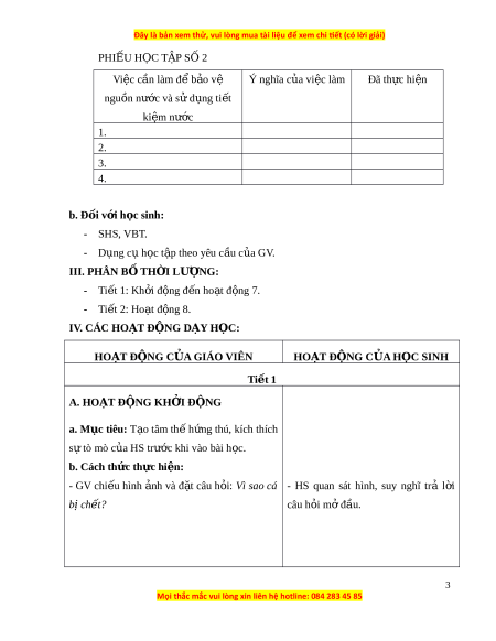 PHIẾU HỌC T P Ậ SỐ 2 Việc c n ầ làm đ ể b o ả vệ Ý nghĩa c a ủ vi c ệ làm Đã th c ự hi n ệ ngu n ồ n c ướ và s ử d n ụ g ti t ế kiệm n c ướ 1. 2. 3. 4. b. Đ i ố v i ớ h c ọ sinh: - SHS, VBT. - D n ụ g c ụ h c ọ t p ậ theo yêu c u ầ c a ủ GV. III. PHÂN B Ố TH I Ờ LƯ N Ợ G: - Ti t ế 1: Kh i ở đ n ộ g đ n ế ho t ạ đ n ộ g 7. - Ti t ế 2: Ho t ạ đ n ộ g 8. IV. CÁC HO T Ạ Đ N Ộ G D Y Ạ H C Ọ : HOẠT ĐỘNG C A Ủ GIÁO VIÊN HO T Ạ ĐỘNG C A Ủ H C Ọ SINH Tiết 1 A. HO T Ạ Đ N Ộ G KH I Ở Đ N Ộ G a. M c ụ tiêu: T o ạ tâm th ế h n ứ g thú, kích thích s ự tò mò c a ủ HS tr c ướ khi vào bài h c. ọ b. Cách th c ứ th c ự hi n: ệ - GV chi u ế hình n ả h và đ t ặ câu h i