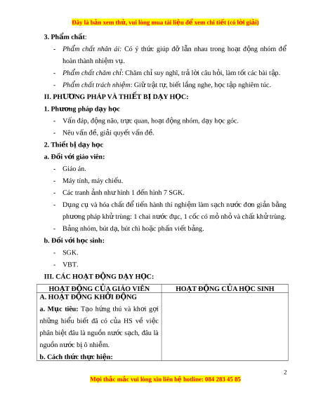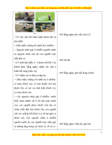 II. PHƯƠNG PHÁP VÀ THI T Ế B Ị D Y Ạ H C Ọ : 1. Phư ng ơ pháp d y ạ h c ọ - Vấn đáp, đ n ộ g não, tr c ự quan, ho t ạ đ n ộ g nhóm, d y ạ h c ọ góc. - Nêu v n ấ đ , ề gi i ả quy t ế v n ấ đ . ề 2. Thi t ế b ị d y ạ h c ọ a. Đ i ố v i ớ giáo viên: - Giáo án. - Máy tính, máy chi u ế . - Các tranh n ả h nh ư hình 1 đ n ế hình 7 SGK. - D n ụ g cụ và hóa ch t ấ để ti n ế hành thí nghi m ệ làm s ch ạ n c ướ đ n ơ gi n ả b n ằ g ph n ươ g pháp kh ử trùng: 1 chai n c ướ đ c, ụ 1 c c ố có m ỏ nh ỏ và ch t ấ kh ử trùng. - B n ả g nhóm, bút d , ạ bút chì ho c ặ ph n ấ vi t ế b n ả g. b. Đ i ố v i ớ h c ọ sinh: - SGK. - VBT. III. CÁC HO T Ạ Đ N Ộ G DẠY H C Ọ : HO T Ạ ĐỘNG C A Ủ GIÁO VIÊN HOẠT ĐỘNG C A Ủ H C Ọ SINH A. HOẠT ĐỘNG KH I Ở Đ N Ộ G a. M c ụ tiêu: T o ạ h n ứ g thú và kh i ơ g i ợ nh n ữ g hi u ể bi t ế đã có c a ủ HS về vi c ệ phân bi t ệ đâu là ngu n ồ n c ướ s ch ạ , đâu là ngu n ồ n c ướ b ịô nhi m. ễ b. Cách th c ứ th c ự hi n: ệ 2 M i