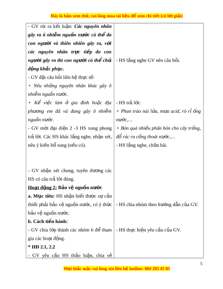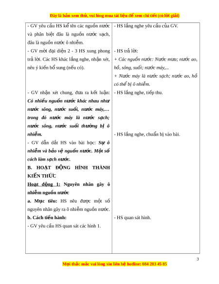 ệ đ xe ể m chi ti t (c ế ó lời gi i ả ) - GV yêu c u ầ HS kể tên các ngu n ồ n c ướ - HS l n ắ g nghe yêu c u ầ c a ủ GV. và phân bi t ệ đâu là ngu n ồ n c ướ s c ạ h, đâu là ngu n ồ n c ướ ô nhi m ễ . - GV m i ờ đ i ạ di n