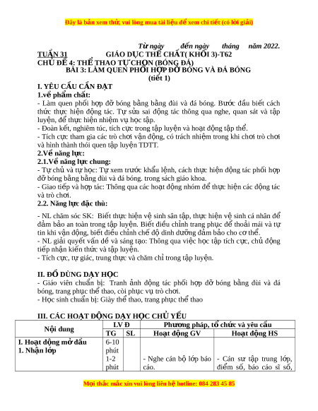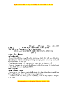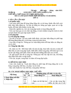 ằ đùi và đá bóng. trong sách giáo khoa. - Giao ti p ế và h p ợ tác: Thông qua các ho t ạ đ ng ộ nhóm đ t ể h c ự hi n ệ các đ ng ộ tác và trò ch i ơ . 2.2. Năng l c đ ự c t ặ hù: - NL chăm sóc SK: Bi t ế th c ự hi n ệ v ệ sinh sân t p, ậ th c ự hi n ệ v ệ sinh cá nhân để đ m ả b o ả an toàn trong t p ậ luy n. ệ Bi t ế đi u ề ch nh ỉ trang ph c ụ đ ể tho i ả mái và tự tin khi v n ậ đ ng, bi ộ t ế đi u ch ề nh ch ỉ đ ế di ộ nh dư ng ỡ đ m ả b o ả cho c t ơ h . ể - NL gi i ả quy t ế v n ấ dề và sáng t o: ạ Thông qua vi c ệ h c ọ t p ậ tích c c, ự ch ủ đ ng ộ ti p nh ế n ậ ki n t ế h c và t ứ p ậ luy n. ệ - Tích c c, t ự ự giác, trung th c ự và chăm ch t ỉ rong t p ậ luy n. ệ II. Đ D Ồ ÙNG D Y Ạ H C Ọ - Giáo viên chu n ẩ b : ị Tranh nh ả đ ng ộ tác ph i ố h p ợ đỡ bóng b ng ằ đùi và đá bóng, trang ph c t ụ h t ể hao, còi ph c v ụ t ụ rò ch i ơ . - H c s ọ inh chu n b ẩ :