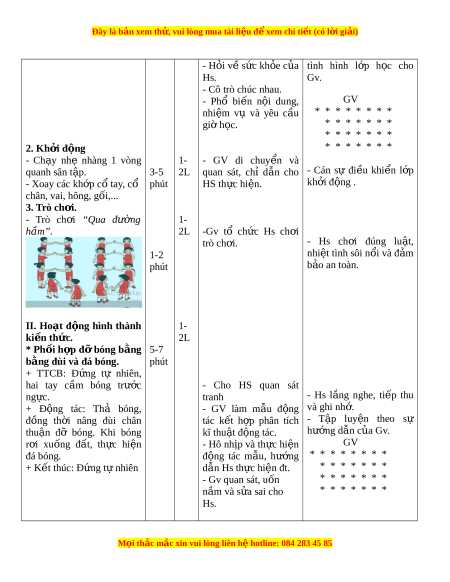 Đây là bản xem th , vu ử i lòng mua tài li u ệ đ xe ể m chi ti t (c ế ó l i ờ gi i ả ) - H i ỏ v s ề c ứ kh e c ỏ a ủ tình hình l p ớ h c ọ cho Hs. Gv. - Cô trò chúc nhau. - Phổ bi n ế n i ộ dung, GV nhi m ệ vụ và yêu c u ầ * * * * * * * * gi h ờ c. ọ * * * * * * * * * * * * * * 2. Kh i ở đ ng ộ * * * * * * * - Ch y ạ nhẹ nhàng 1 vòng 1- - GV di chuy n ể và quanh sân t p. ậ 3-5 2L quan sát, chỉ d n ẫ cho - Cán sự đi u ề khi n ể l p ớ - Xoay các kh p c ớ ổ tay, cổ phút HS th c hi ự n. ệ kh i ở đ ng . ộ chân, vai, hông, gối,... 3. Trò ch i ơ . - Trò ch i ơ “Qua đư ng ờ 1- hầm”. 2L -Gv tổ ch c ứ Hs ch i ơ trò ch i ơ . - Hs ch i ơ đúng lu t ậ , 1-2 nhi t ệ tình sôi n i ổ và đ m ả phút b o an t ả oàn. II. Hoạt đ ng ộ hình thành 1- ki n t ế h c. ứ 2L * Ph i ố h p ợ đ ỡ bóng b ng ằ 5-7