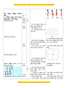 ị Giày thể thao, trang ph c ụ th t ể hao III. CÁC HOẠT Đ N Ộ G D Y Ạ H C Ọ CH Ủ Y U Ế ươ , t ch ổ ức và yêu cầu N i ộ LV Đ Ph ng pháp dung TG SL Hoạt đ ng G ộ V Hoạt đ ng H ộ S I. Hoạt đ ng m ộ đ ở u ầ 6-10 1. Nhận l p ớ phút 1-2 - Nghe cán bộ l p ớ báo - Cán sư t p ậ trung l p, ớ phút cáo. đi m ể số, báo cáo sĩ s , ố M i