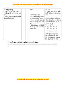 ả ý - Hs cùng Gv hệ th ng ố th c, ứ thái độ h c ọ c a ủ l i ạ bài (HS quan sát SGK Hs. (tranh) trả l i ờ ) - HD sử d ng ụ SGK để GV Hs ôn l i ạ bài và chu n ẩ * * * * * * * * bị bài sau. * * * * * * * * * * * * * * * * * * * * * - HS t p ậ chung th c ự hiện theo hư ng d ớ n ẫ c a G ủ V và nh n ậ hư ng ớ dẫn t p l ậ uy n ệ nhà. ở IV. ĐIỀU CH N Ỉ H SAU TI T Ế D Y Ạ (N U Ế CÓ)