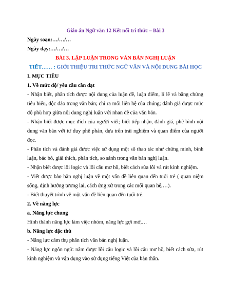 Giáo án Bài 3: Lập luận trong văn bản nghị luận Ngữ Văn 12 Kết nối tri thức
