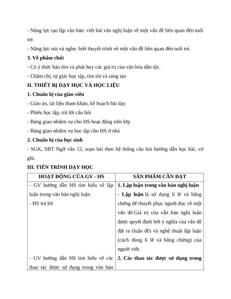 - Năng lực nói và nghe: biết thuyết trình về một vấn đề liên quan đến tuổi trẻ. 3. Về phẩm chất