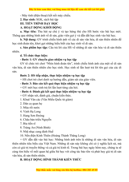 văn hóa, di sản thiên nhiên cho học sinh. Học sinh sẽ lần lượt trả lời tên gọi của các di sản.