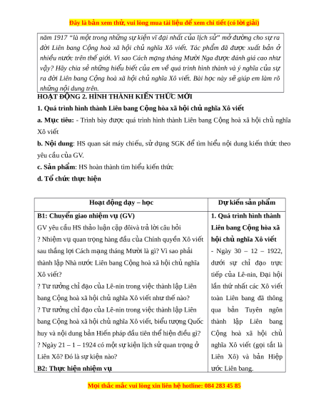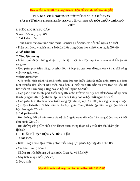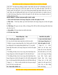 ợ quá trình hình thành Liên bang C ng ộ hoà xã h i ộ ch ủ nghĩa Xô vi t ế - Phân tích đư c ợ ý nghĩa s ự ra đ i ờ c a ủ Liên bang C ng ộ hòa xã h i ộ ch ủ nghĩa Xô vi t ế 2. Về năng lực * Năng lực chung: - Giải quy t ế đư c ợ nh ng ữ nhi m ệ vụ h c ọ t p ậ m t ộ cách đ c ộ l p, ậ theo nhóm và th ể hi n ệ sự sáng tạo. - Góp ph n ầ phát tri n ể năng l c ự giao ti p ế và h p ợ tác qua ho t ạ đ ng ộ nhóm và trao đ i ổ công việc v i ớ giáo viên. *Năng l c ự riêng: - Góp ph n